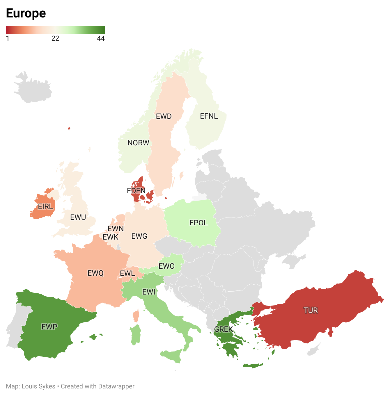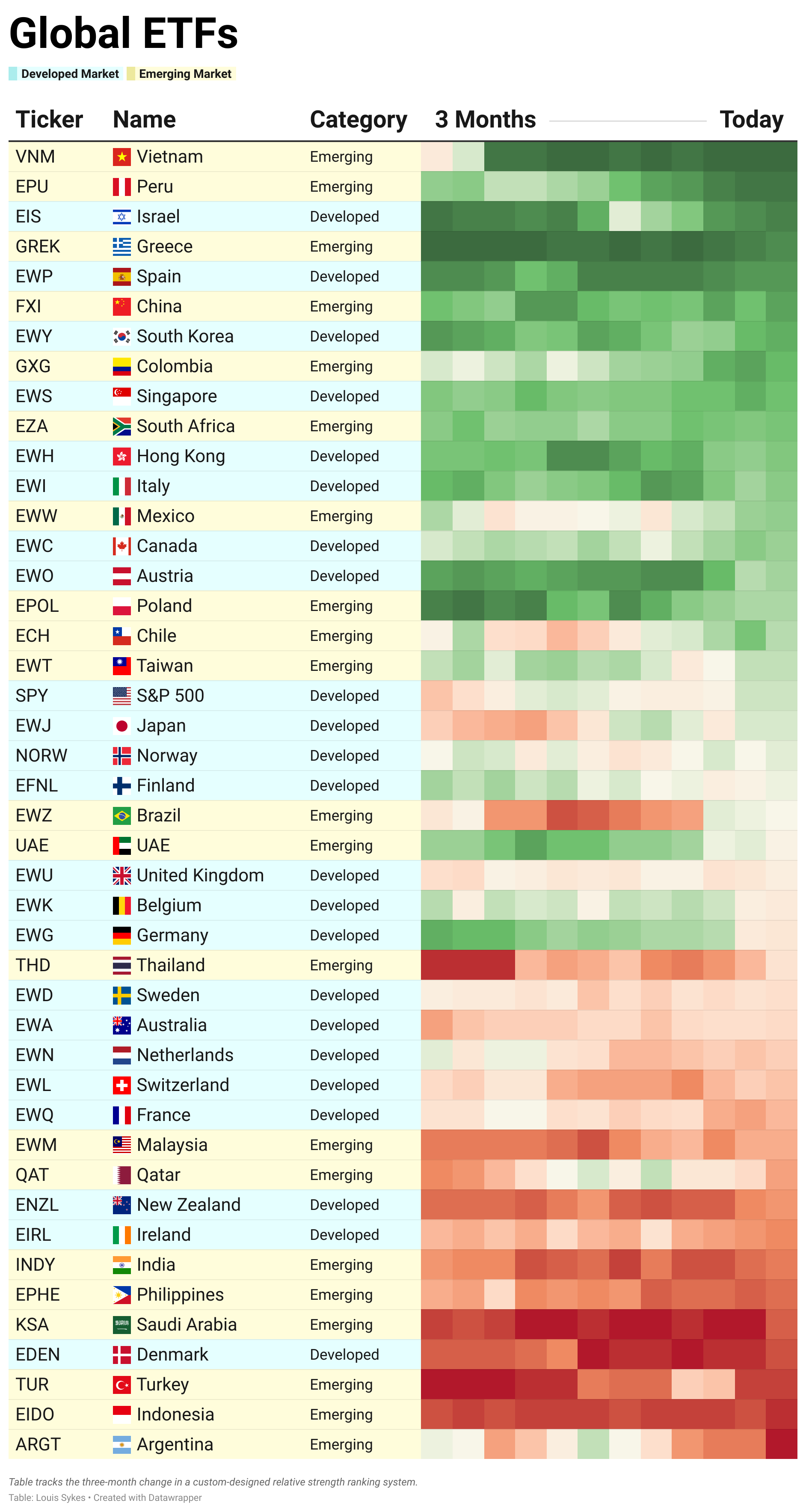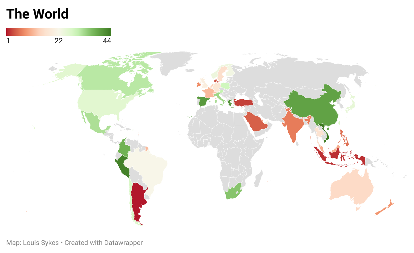 With the strong performance from many international markets this year, let’s zoom out and see how the colours on our ETF Power Rankings translate onto the global map, using the most recent coloured square on the above table.