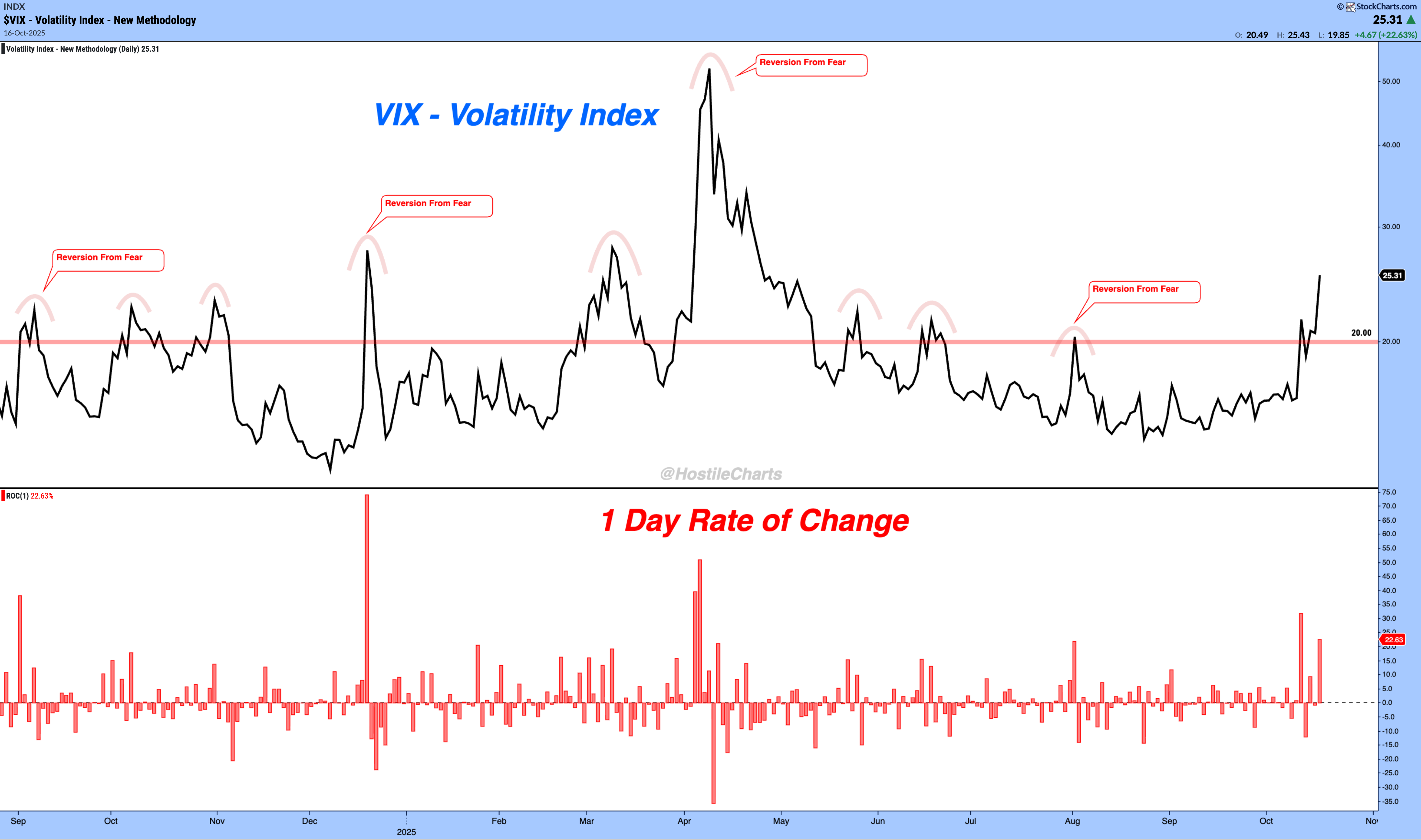 Thompson's Two Cents Don't Buy Fear I Got A Better Idea By Larry Thompson October 16, 2025 The market is LOUD right now.That’s not typical of a healthy bull market. Bull markets are smooth as volatility quiets down, breadth expands, and money flows with less resistance. What we’re seeing now is the opposite.Just take a look at the VIX - the market’s measure of expected volatility over the next 30 days. When volatility spikes like this, people start feeling the urge to be a hero, to call the bottom, buy the dip, or “fade the fear.” The problem is, we’re still in the middle of it. We don’t know where the end is. No one does.The best way to find the end is through price itself. Either through capitulation (a blow-off panic) or resolution (stabilization and strength). This is the messy middle. The part where money made on the way up often gets handed back because traders force trades that aren’t there.Don’t play that game.Take a step back and wait for the easier pitches. Because the money you make when the market is calm spends the same as the money made when it’s chaotic.The VIX above 20 tells us fear is present. And despite what you’ll hear from contrarians online, fear itself isn’t bullish. What’s bullish is the reversion from fear. When volatility starts to cool off. When panic gives way to stability. When things stop getting worse.And we're just not there yet.Anyways, that’s my two cents. All Gas No Brakes | Ep. 4This week is All Gas No Brakes - my favorite show to run.It was originally meant to be a once-a-month show. But with markets this messy, I want to walk through the signals I’m watching to find clarity amid the noise.20 charts. 20 minutes. That’s it.Set a reminder, catch it live, or watch the replay on YouTube. More from Thompson's Two Cents Larry Thompson The Sunday Stalk List | Ep. 19 Let The Dust Settle October 11, 2025 Larry Thompson The Market’s Favorite Trick It's Never This Loud October 7, 2025 Larry Thompson The Sunday Stalk List | Ep. 18 15 Charts I'm Stalking October 5, 2025 Sign Up TodayGet expert market insights delivered straight to your inbox. You must have JavaScript enabled to use this form. Email Address