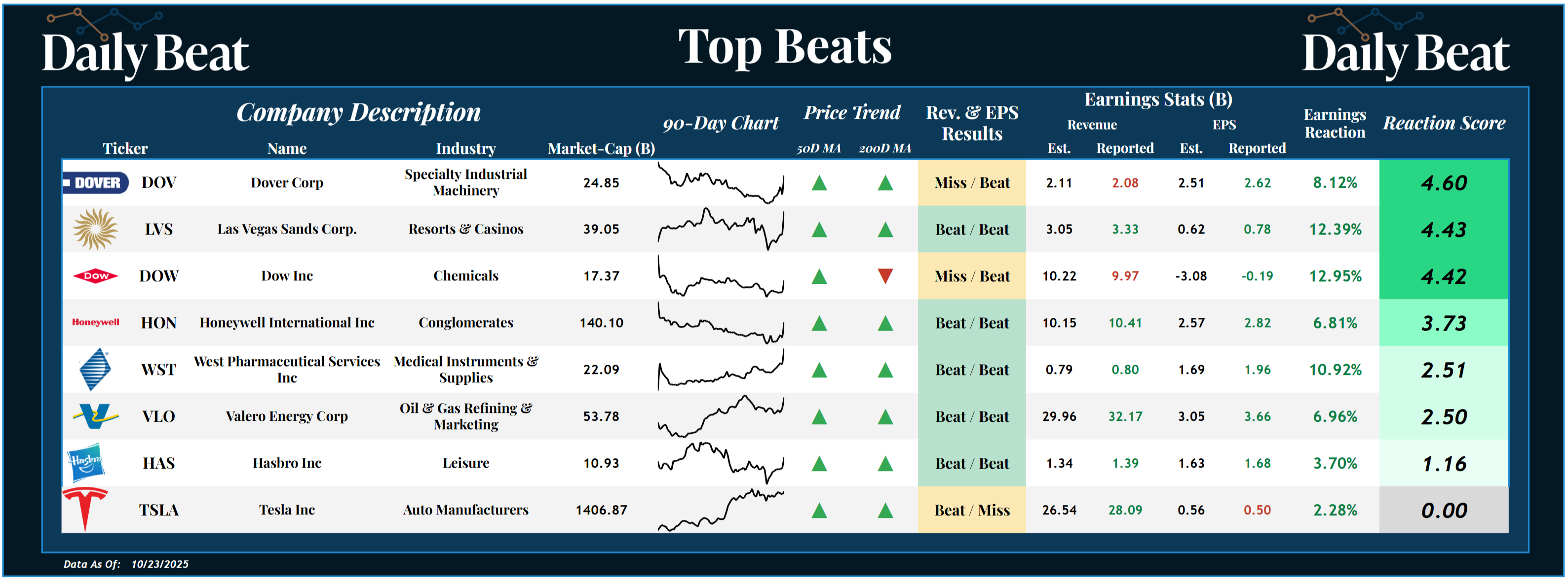 At the top of Thursday's list was Dover $DOV, a $25B producer of industrial equipment and components for markets like energy, packaging, and refrigeration. The company reported mixed results, but the market rewarded shareholders with a +4.60 reaction score.