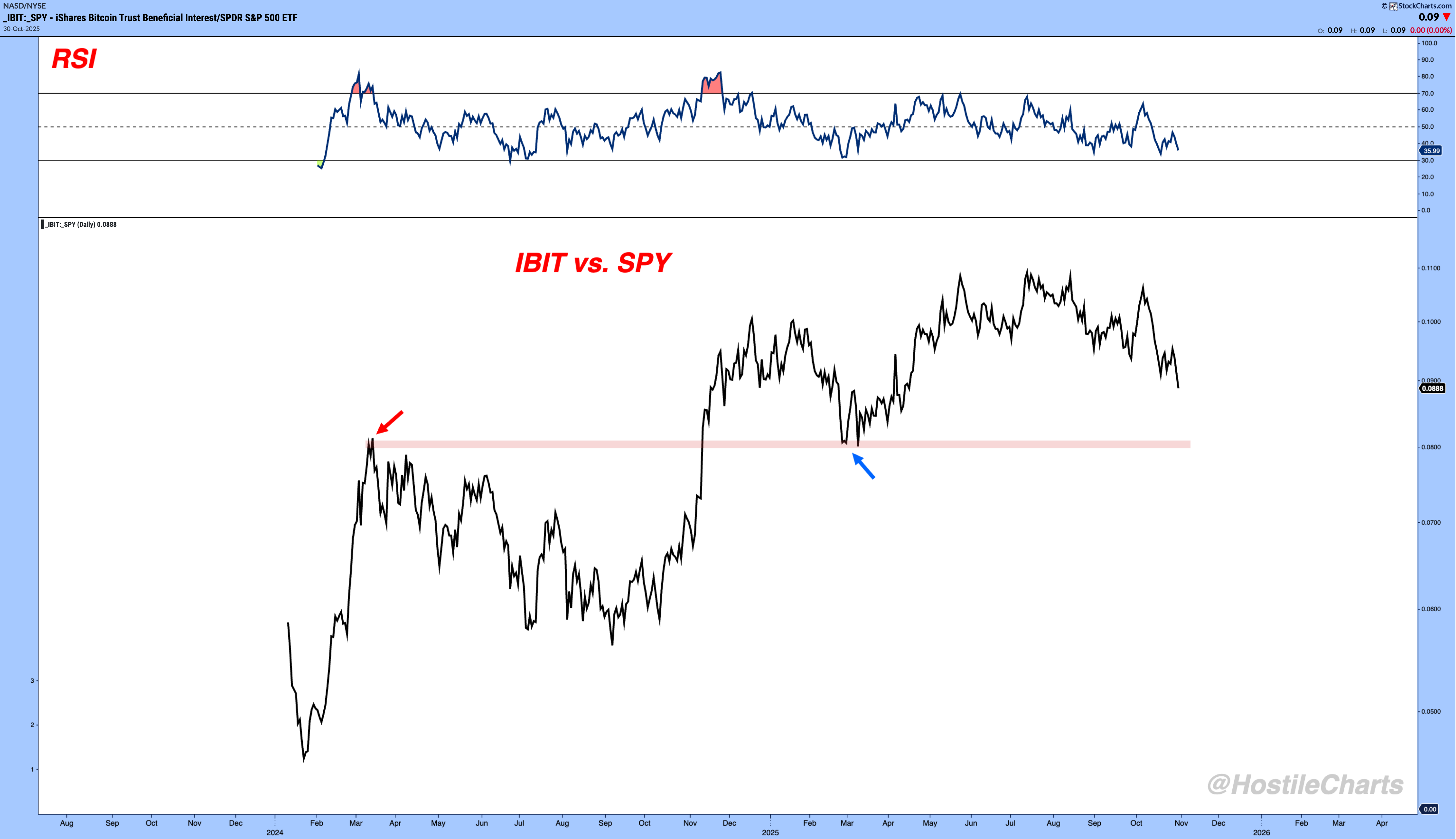 Thompson's Two Cents Bitcoin Looks Spooky The 4 Warning Signs By Larry Thompson October 30, 2025 The market speaks if you’re willing to listen.And its language is Price.Price holds the key. It’s never about one moving average or one indicator.It’s about the context of those tools relative to price itself.Right now, that message in Bitcoin isn’t sweet.Price is giving us 4 warning signs that this is looking more like a trick than a treat.Let’s start with the absolute chart of IBIT (iShares Bitcoin Trust). Warning #1: The failed breakout - buyers couldn’t sustain momentum above prior highs.Warning #2: The failed recovery - RSI barely reclaimed 50 before rolling over again. Momentum never flipped back to the bulls.Warning #3: Price has now broken below the April Low AVWAP, a key area where demand previously stepped in.That’s three strikes on the absolute chart.Then we look at IBIT relative to SPY and that’s Warning #4. The ratio is breaking lower with no major support until the spring lows. In plain English, Bitcoin is underperforming stocks and has room for that to continue. Could Bitcoin be setting up a fake-out before another run higher? Sure! Markets love to trick us before they treat us.But that’s not the bet worth making when the evidence says otherwise.For now, the message is simple: Let Bitcoin prove it deserves your capital before you hand it over.Anyways, that’s my two cents.Thompson's Two Cents Live!Friday 5pm ESTTomorrow I’ll be breaking down my favorite setups in the market.The ones no nobody's talking about but everyone will be chasing later.Set a reminder, catch it live, or watch the replay on YouTube. More from Thompson's Two Cents Larry Thompson The Sunday Stalk List | Ep. 21 A "SHOW ME" Market November 2, 2025 Larry Thompson The Rule vs. The Exception A Bull Market Chart October 28, 2025 Larry Thompson Don't Buy Fear I Got A Better Idea October 16, 2025 Sign Up TodayGet expert market insights delivered straight to your inbox. You must have JavaScript enabled to use this form. Email Address