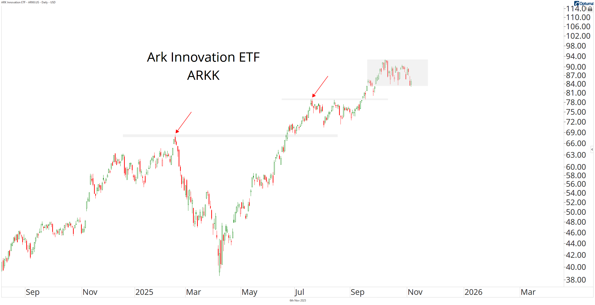 Something we're closely monitoring is the resolution out of ARKK; a key barometer for speculative growth. Right now, like many ETFs, it's consolidating and moving sideways.