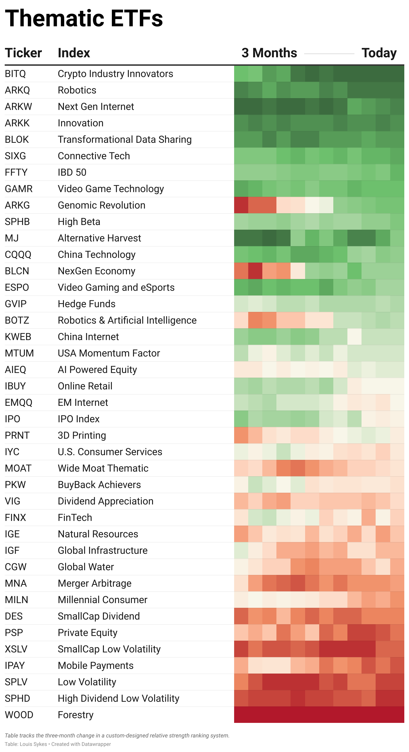 And with leadership in our table pointing to risk-on thematic ETFs, like Crypto $BITQ, Innovation $ARKK, and High Beta $SPHB, this is all evidence of a healthy bull market.