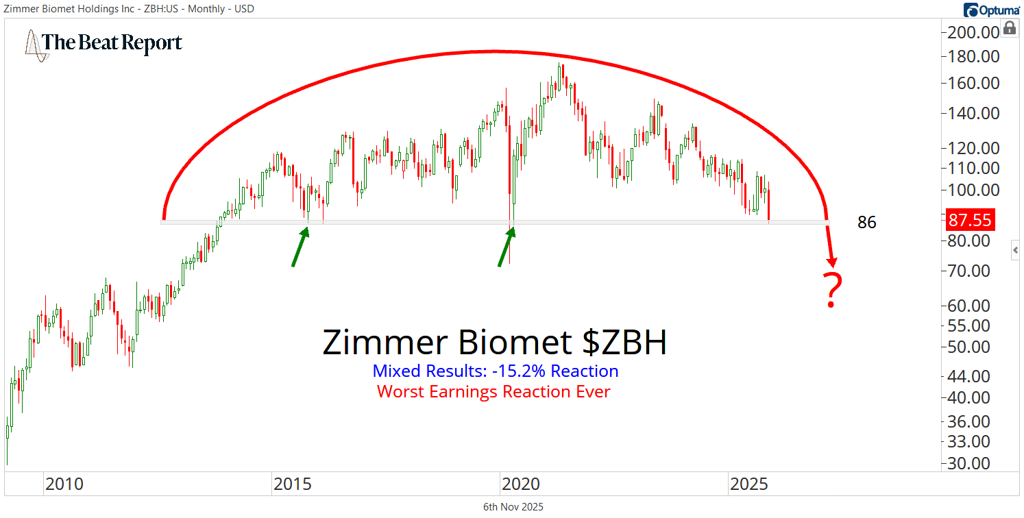 At the bottom of Wednesday's list was the $17B provider of orthopedic implants and surgical devices, Zimmer Biomet $ZBH. The company had mixed headline results and suffered a -8.88 reaction score.