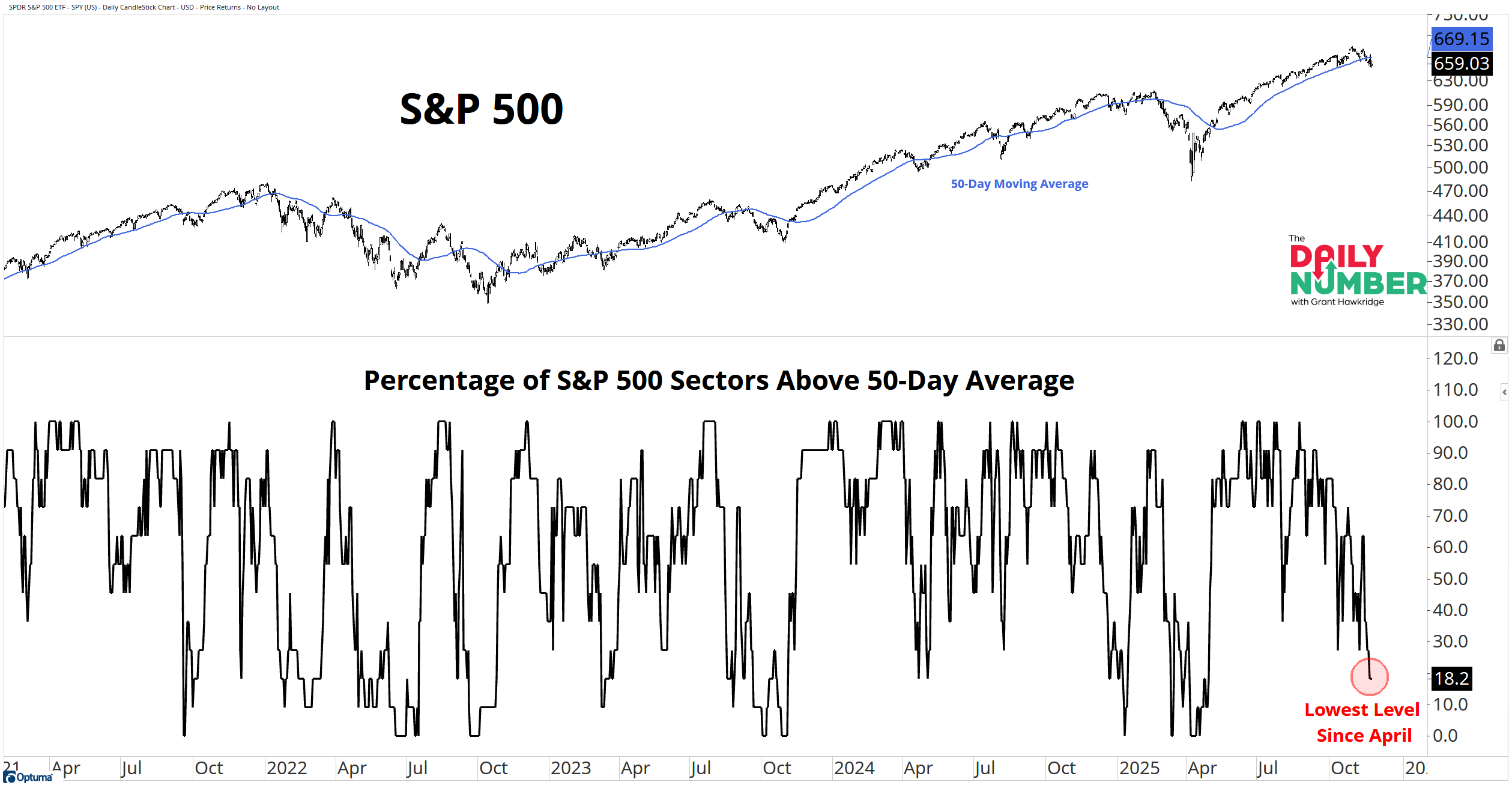 The Daily Number One number. One chart. One insight moving markets today. Only Two Sectors Still Holding Up 😬 By Grant Hawkridge November 24, 2025 Today's number is... 18.2%Only 18.2% of S&P 500 sectors sit above their 50-day moving average, the weakest reading since April.Here’s the chart: Let's break down what the chart shows: The top panel displays the S&P 500 in black with a blue 50-day moving average.The lower panel displays a black line that tracks the percentage of S&P 500 sectors above their 50-day moving average.The Takeaway: Only 2 of 11 sectors are still above their 50-day moving average.Healthcare and Energy are the last ones standing. Everything else has broken trend.The S&P 500 is over 4% off its high and now trades below its own 50-day average.Price and participation are both under pressure.Last week’s 2% drop came as sector trends were already fading. Now the damage is clear. Breadth cracked first. Price is following.When breadth gets this weak, the tape shifts. Rallies struggle. Sellers press harder. Every move hits with more weight.The longer this stays down, the harder it gets for the index to bounce cleanly.Either participation picks up, or the index goes looking for stronger footing.Does this reset bring leadership back in, or is the pullback just getting started?Let me know! Grant Hawkridge | Chief Aussie Operator, All Star ChartsNeed a full trading toolkit that actually helps you make moves?All Star Charts Premium gives you daily trade ideas, proprietary scans, and access to our entire analyst team.If you're serious about leveling up your strategy.Start Here!If you find my content valuable, I would greatly appreciate it if you could share it with your friends, family, and colleagues. Your help in spreading the word is invaluable in supporting our work. Thank you to all of you who share!Sign Up Free For The Daily Number More from The Daily Number Grant Hawkridge Canaries Just Flew Out of the All Clear Zone 🐦 November 21, 2025 Grant Hawkridge Leadership Just Lost Its Grip ⚠️ November 20, 2025 Grant Hawkridge Two Risk Gauges, One Big Decision🚦 November 19, 2025 Get the Number That MattersGrant’s Daily Number cuts through the noise to spotlight the single most important data point moving markets right now. You must have JavaScript enabled to use this form. Email Address