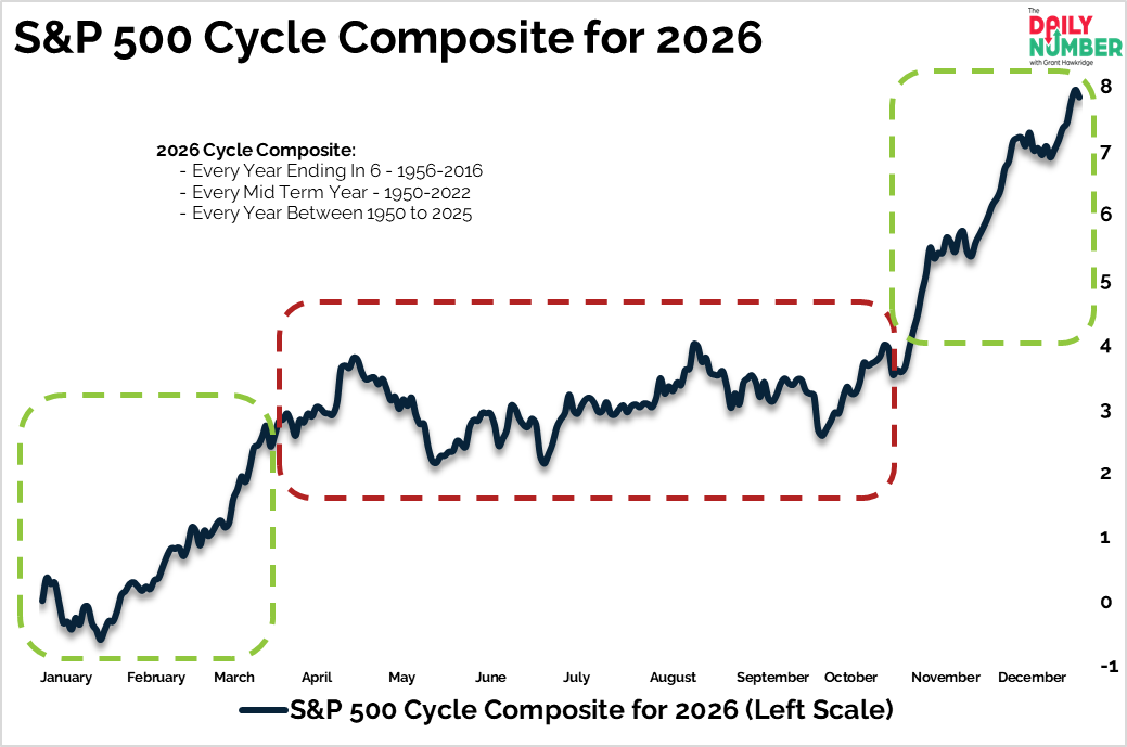 The Takeaway: This composite combines every year ending in 6, every midterm year, and all years from 1950 to 2025. It builds an average path for the S&P 500 in 2026.