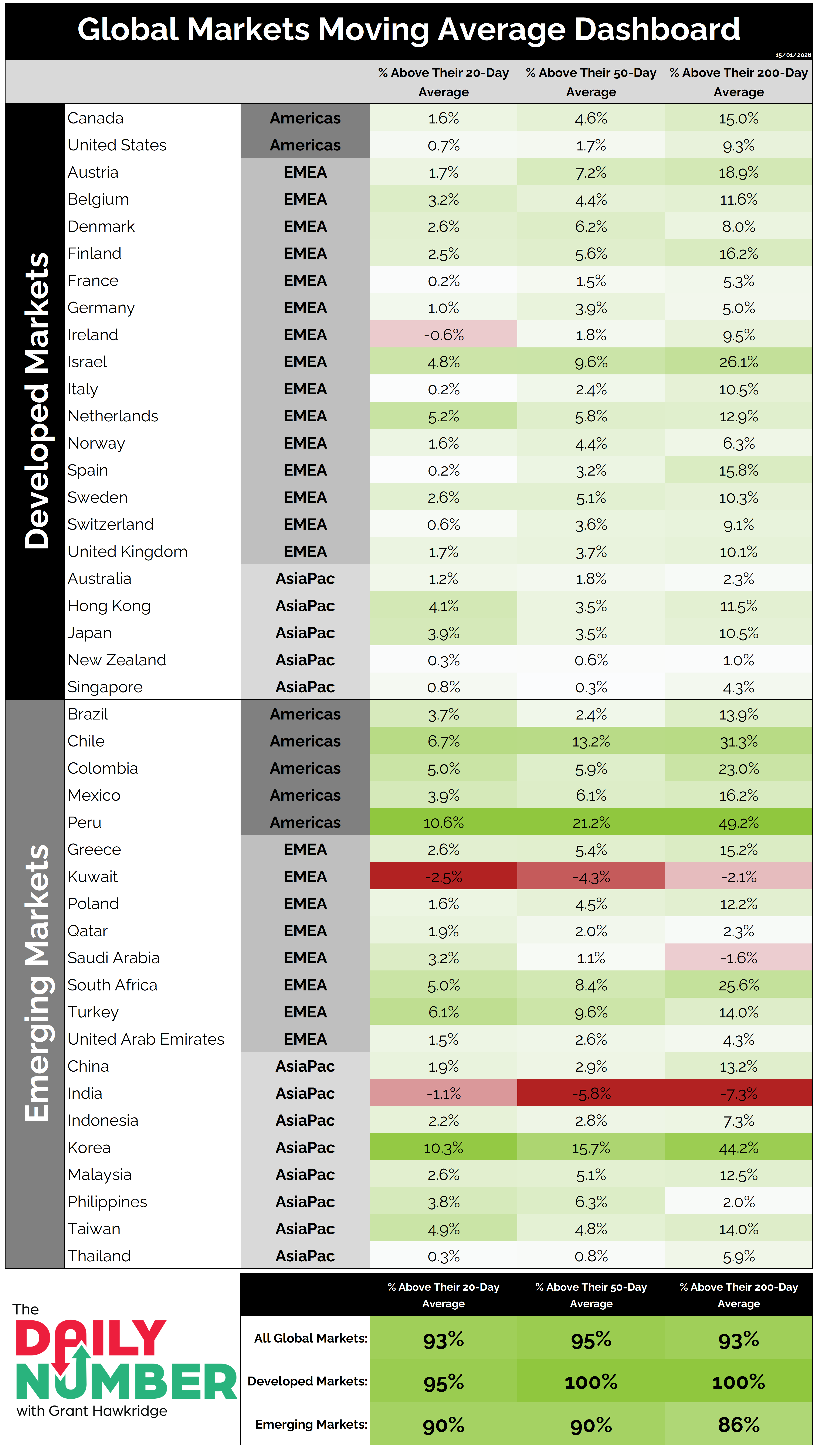 A summary section at the bottom reports aggregate readings for all global, developed, and emerging markets across the three timeframes.