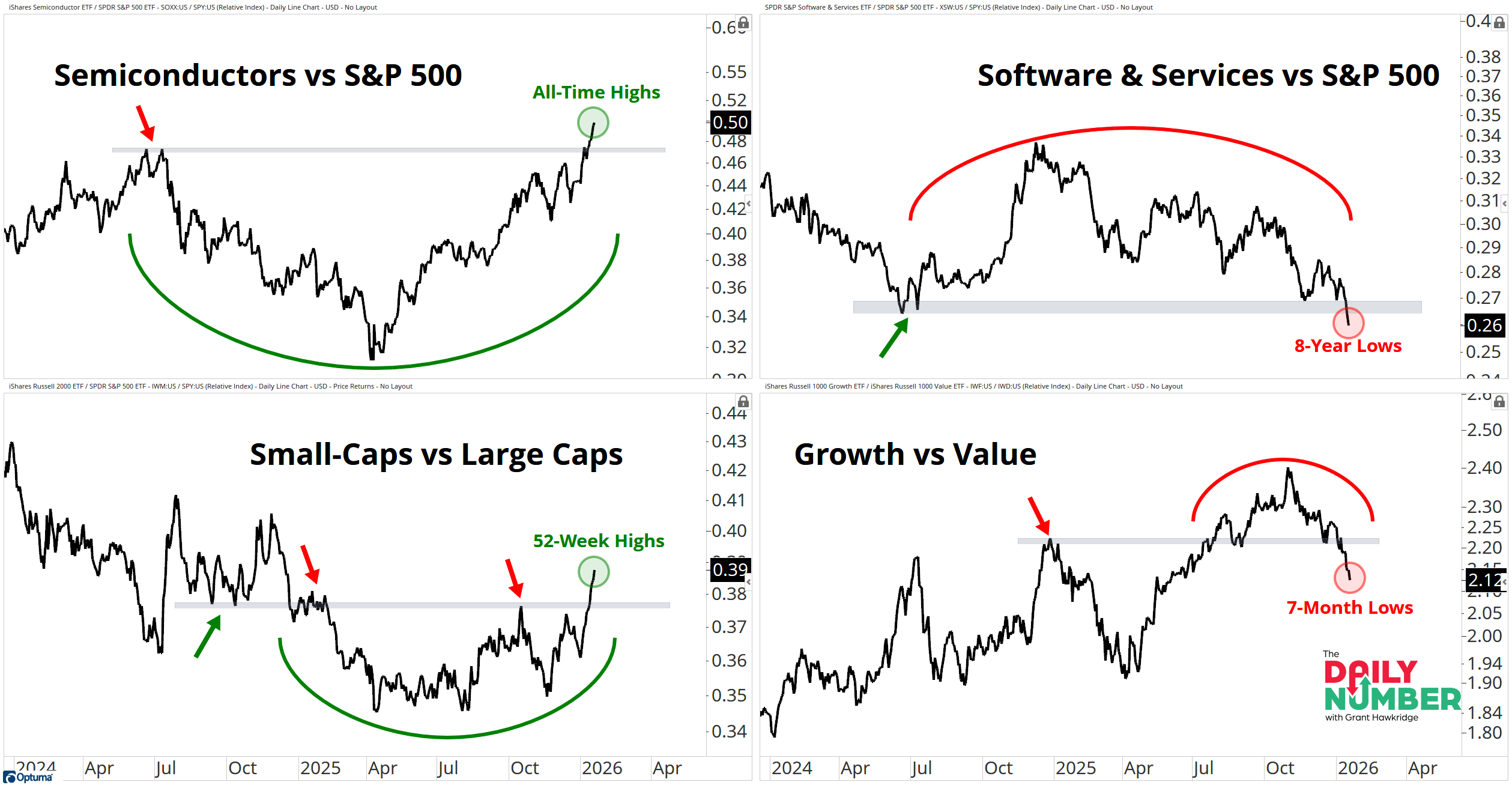 The top-left panel shows Semiconductors relative to the S&P 500