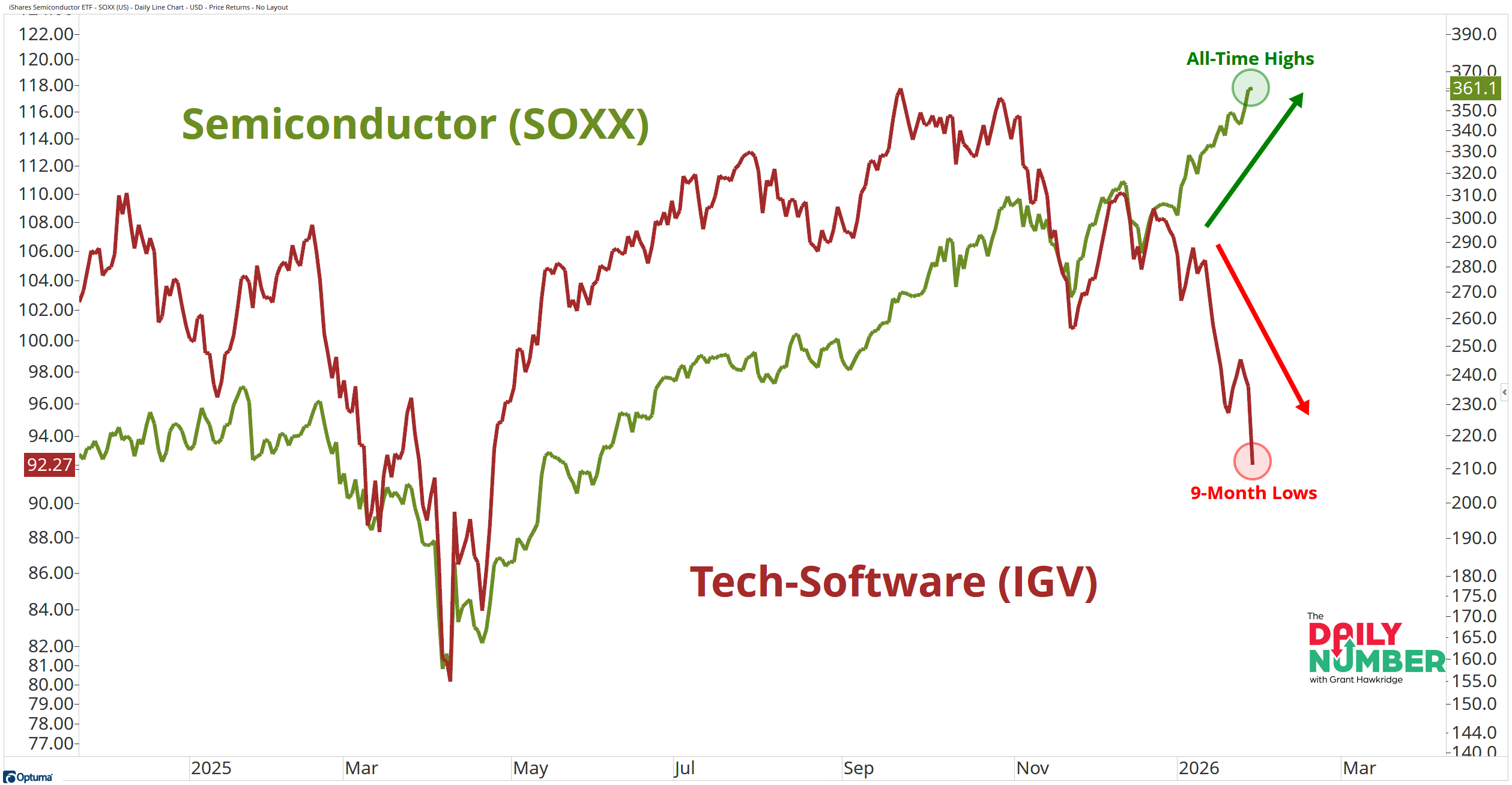 The Takeaway: A 21% drawdown in software sits next to all-time highs in semiconductors.