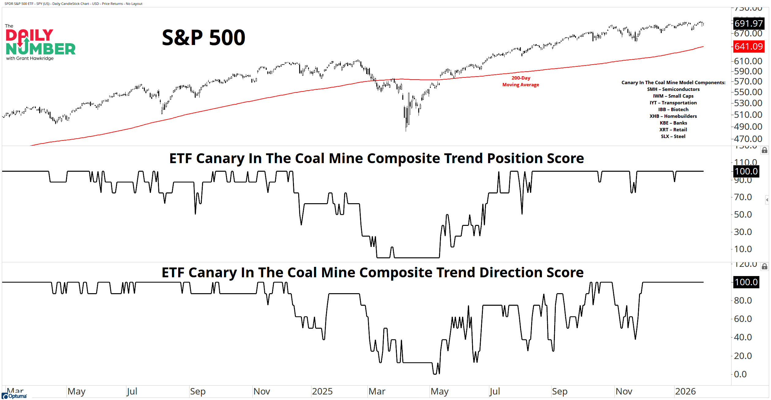 The ETF Canary In The Coal Mine Composite Trend Position Score is 100%, and the Trend Direction Score is also 100%.