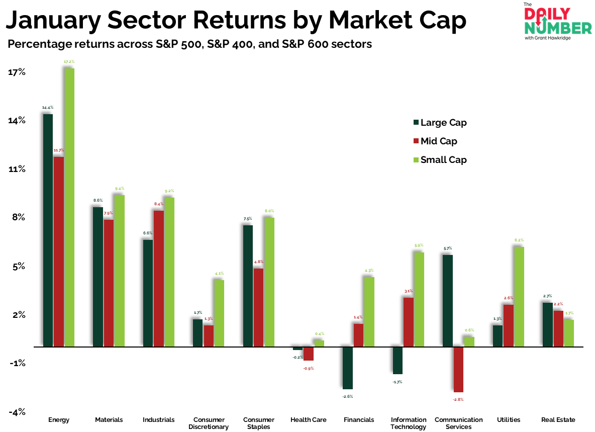 The Takeaway: January finished with small caps leading in 9 of 11 sectors.