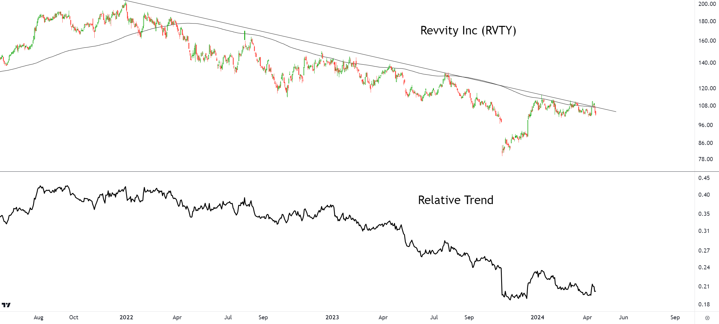 Currently, the stock of Revvity Inc is in a downtrend. The stock's price has been consistently declining, indicating a lack of buying interest and potential selling pressure in the market. The downtrend suggests a bearish sentiment and a potential continuation of the downward movement.