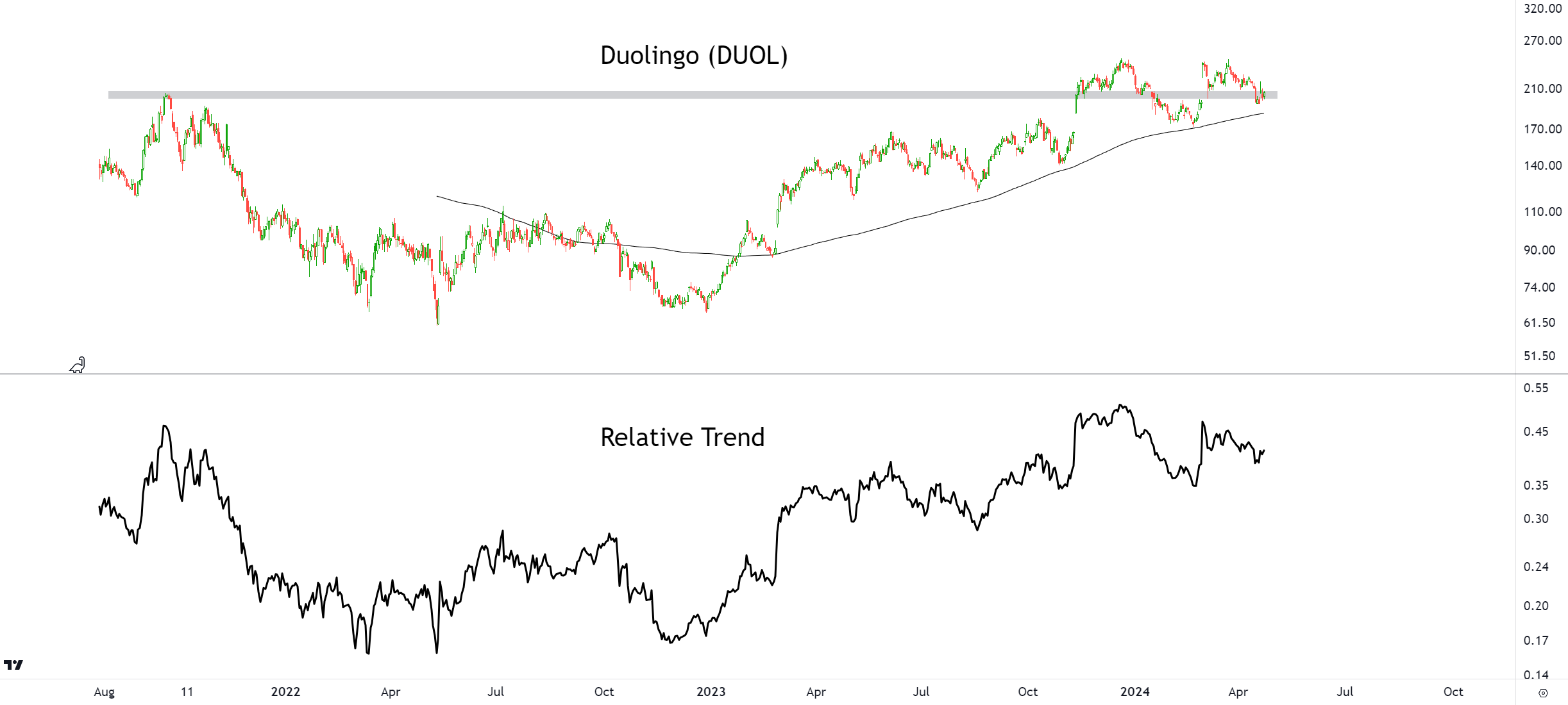 The stock of Duolingo, ticker DUOL, is showing signs of a potential long-term breakout. After a period of consolidation, the stock has been gradually trending higher, forming a series of higher highs and higher lows. This indicates a bullish trend and suggests that buyers are gaining control.