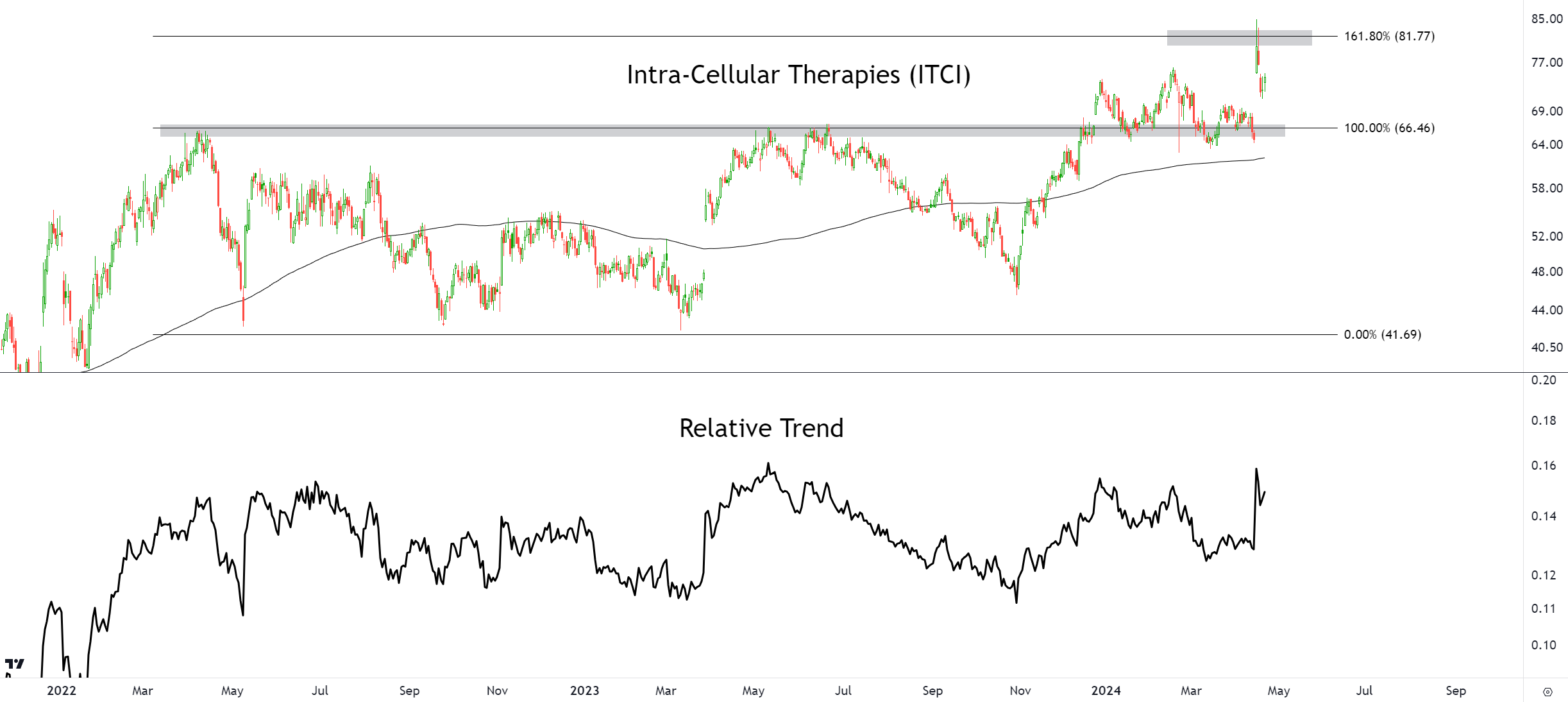 The stock of Intracellular Therapies (ITCR) is currently undergoing a consolidation phase after testing the 161.8% extension level. This level is often considered a significant resistance point in technical analysis. Following the test, the stock has been moving sideways, indicating a period of indecision among market participants.
