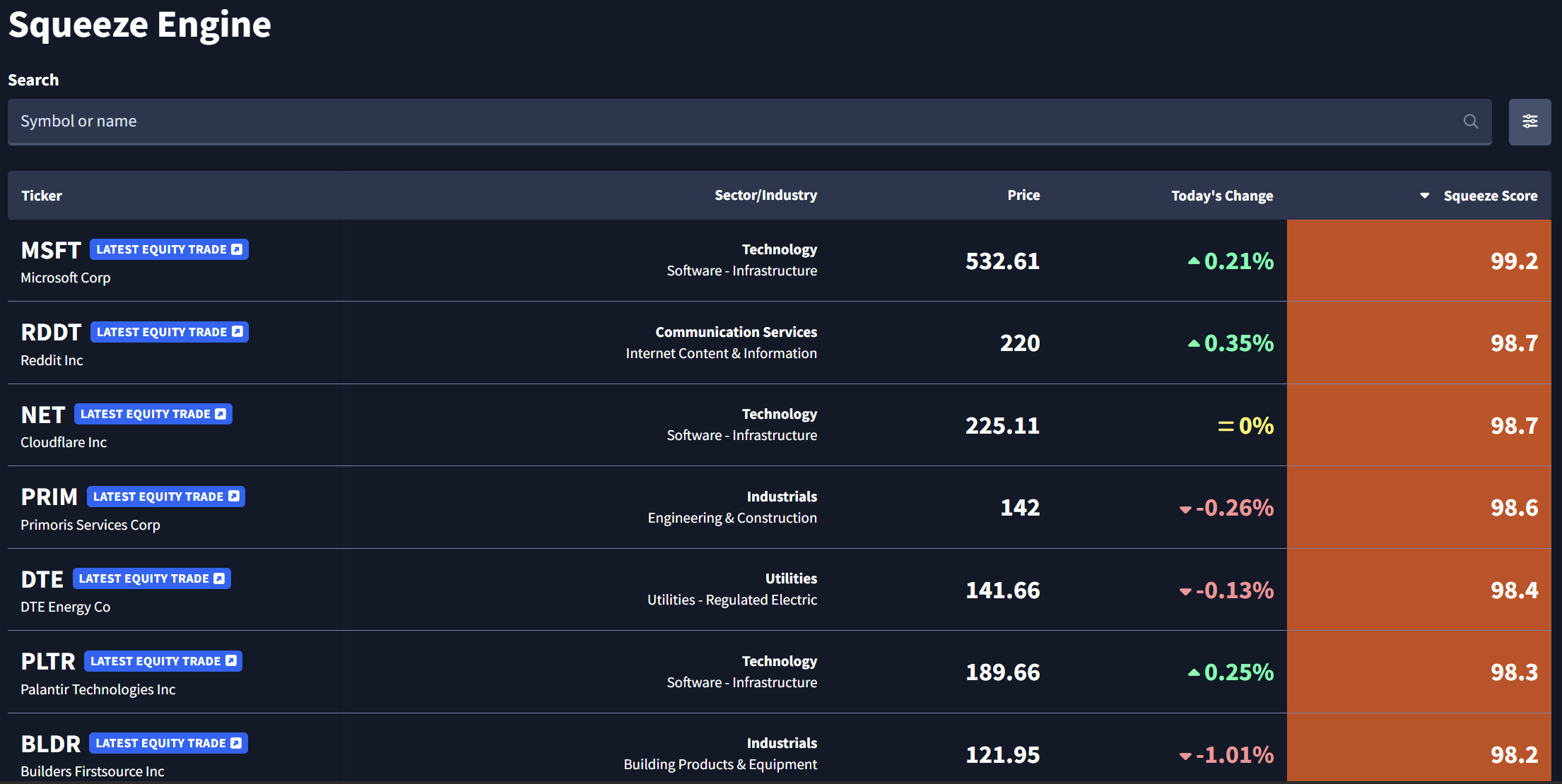 The Squeeze Engine automatically populates with live data on a 10-minute delay.